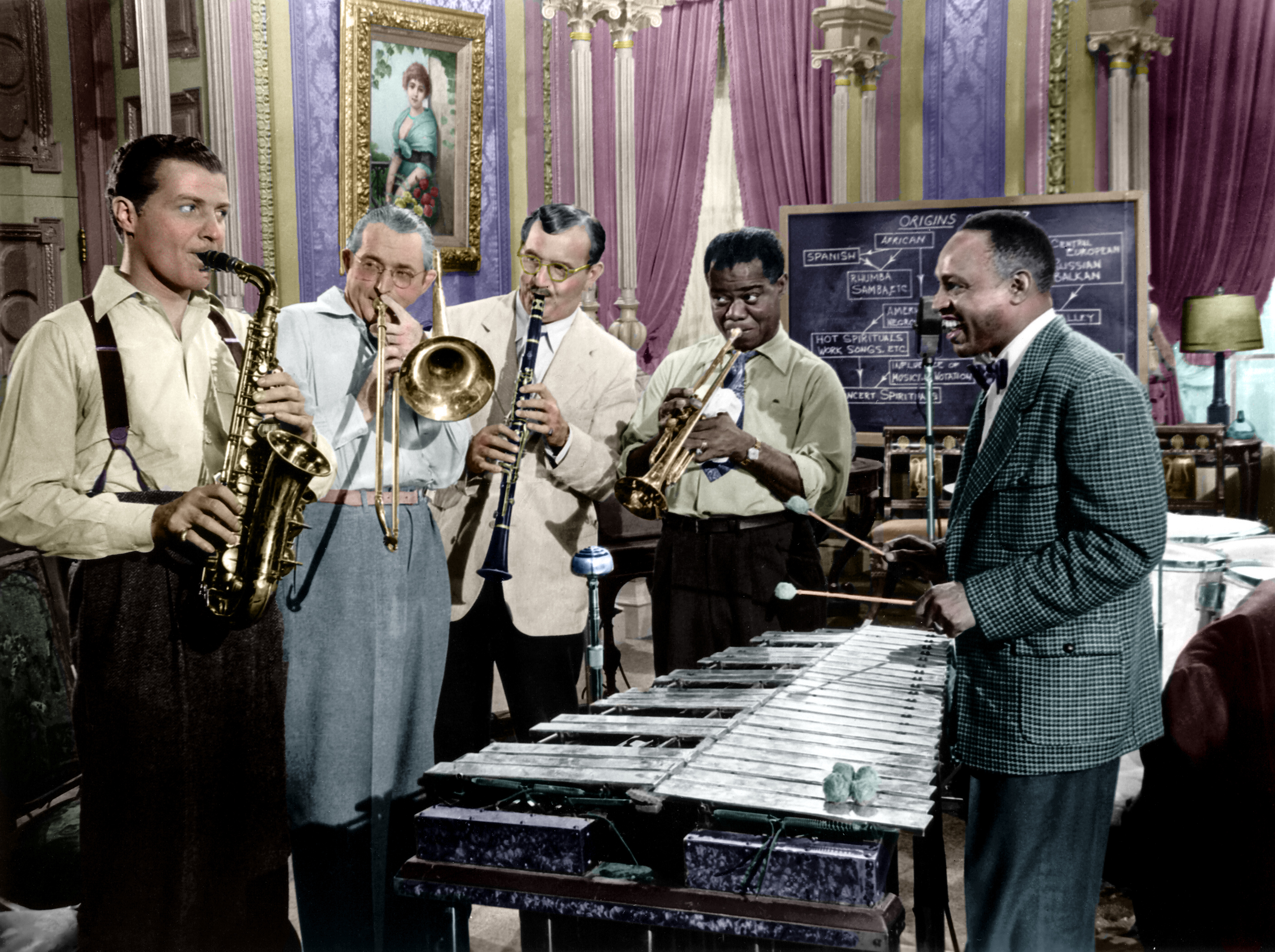 (L to R) Charlie Barnett, Tommy Dorsey, Benny Goodman, Louis Armstrong, Lionel Hampton