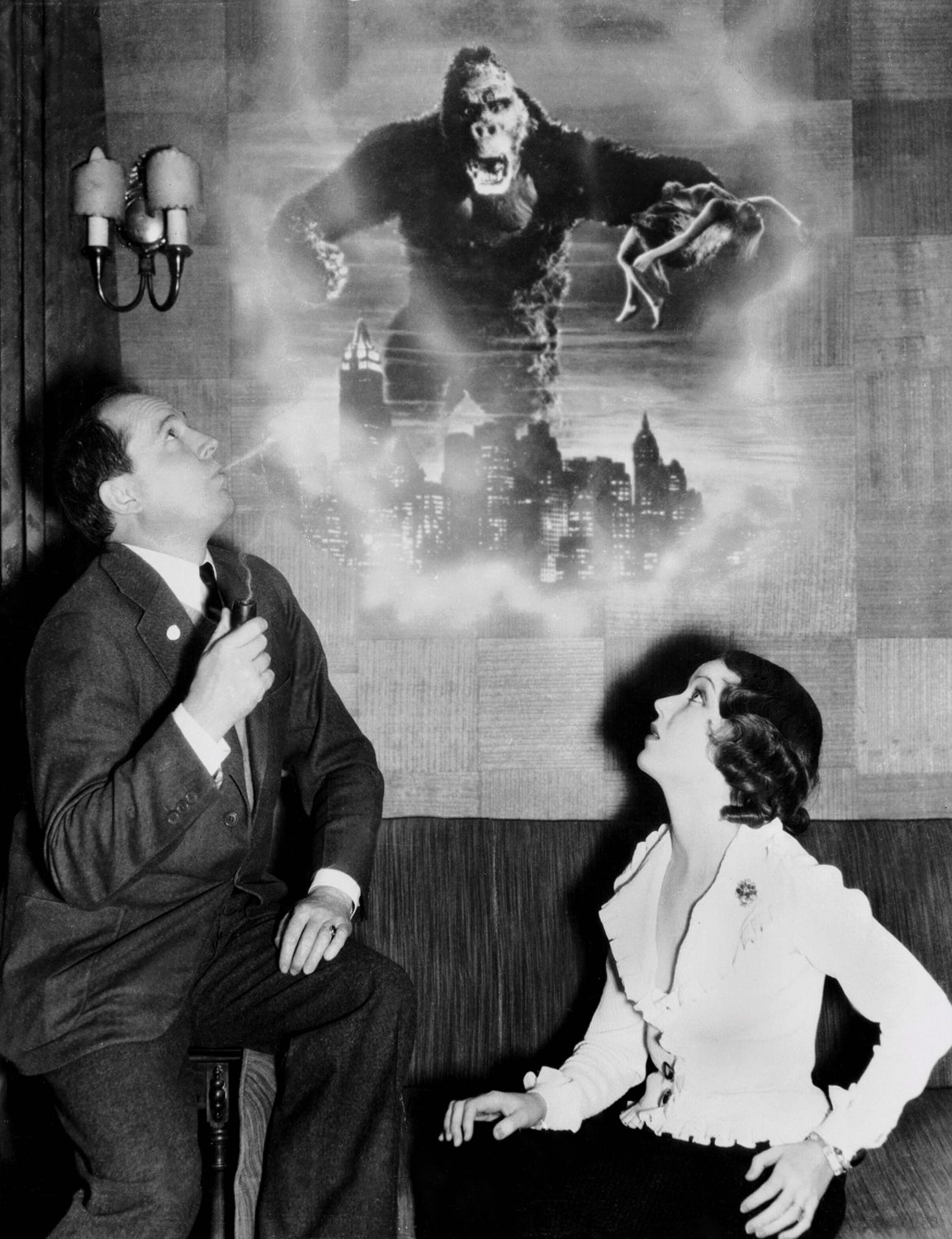 (L to R seated) Bruce Cabot, Fay Wray, Ernest B. Schoedsack (photo taken at a mockup of the dirigible mooring mast pinnacle of the Empire State Building)