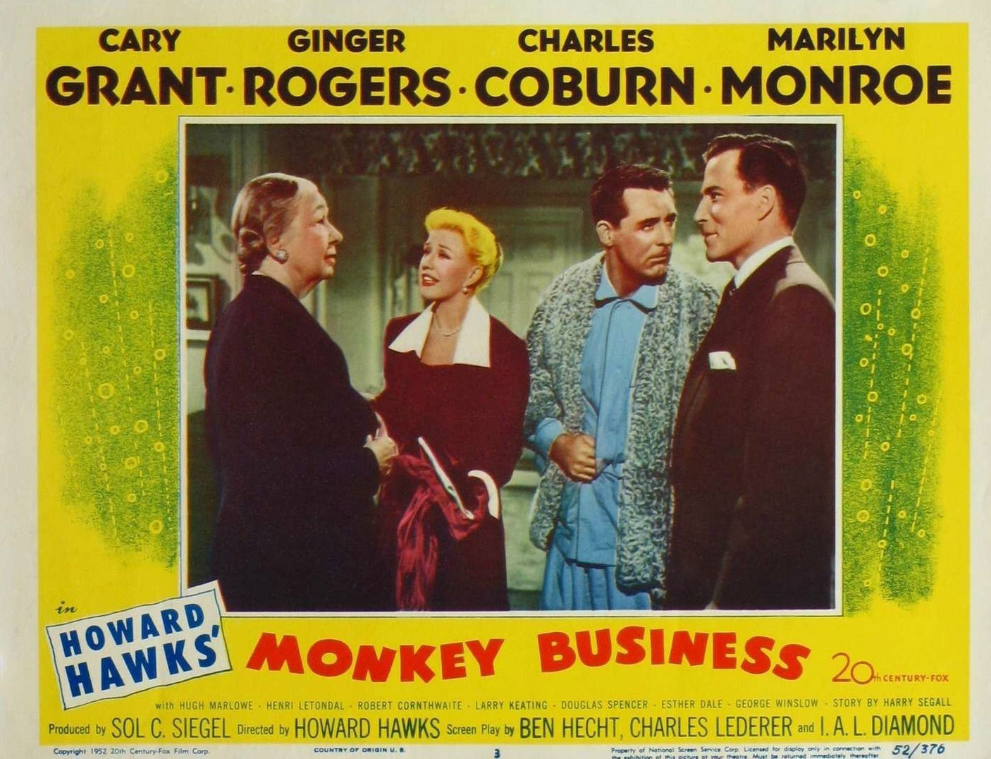 20th Century Fox, 1952. Directed by Howard Hawks. Camera: Milton Krasner. With Cary Grant, Ginger Rogers, Charles Coburn, Marilyn Monroe, Hugh Marlowe.