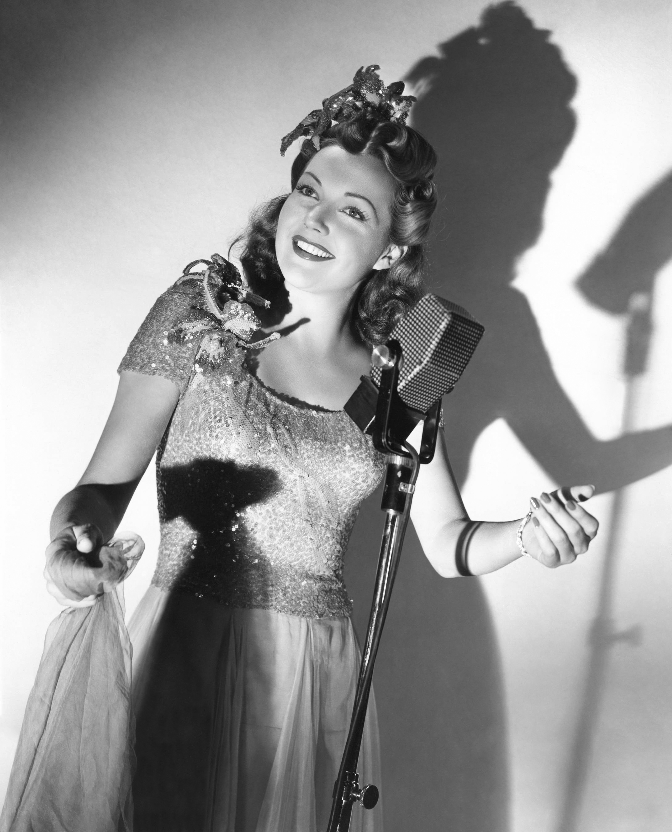 Lynn Bari stands ready at the microphone in a nice posed shot.